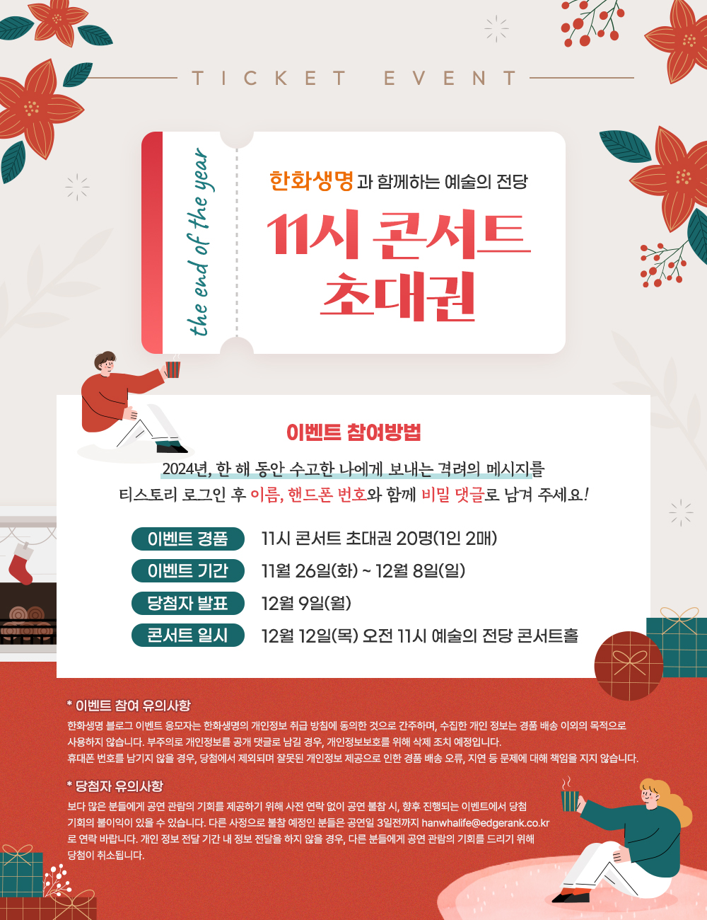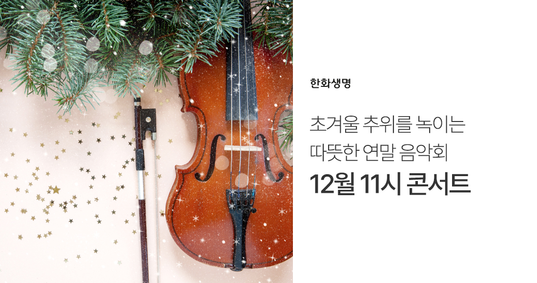 문밖에 나와 숨을 흡 들이켜면 금세 목 안까지 차가워지는 걸 보니, 이제 정말 겨울인가 봅니다. 정든 2024년과도 시원섭섭한 작별을 해야 할 날이 가까워져 옵니다. 여러분의 지난 한 해는 어떠셨나요? 행복하고 뿌듯한 기분도, 살짝 아쉬운 마음도, 모두 잘 돌보면서 따뜻한 연말 보내실 수 있도록 한화생명이 12월 11시 콘서트로 돌아왔어요.