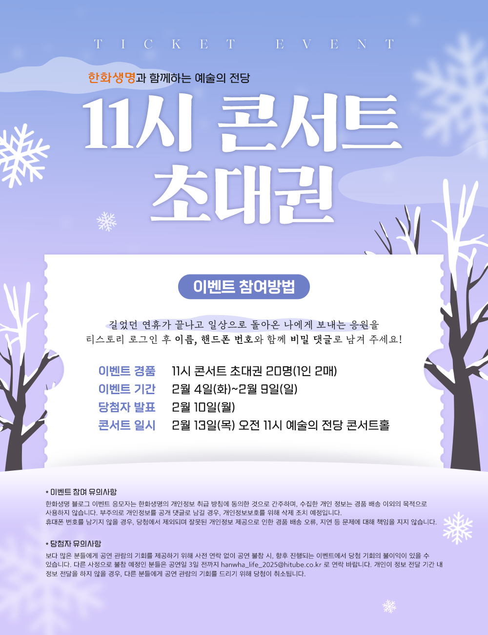 긴 설 연휴가 지나고 다시 일상으로 돌아왔습니다. 하지만 아직도 연휴의 여운이 남아있지는 않으신가요? 한화생명이 준비한 2월 11시 콘서트에서 차분한 클래식 선율과 함께 일상의 리듬을 다시 찾아보세요!