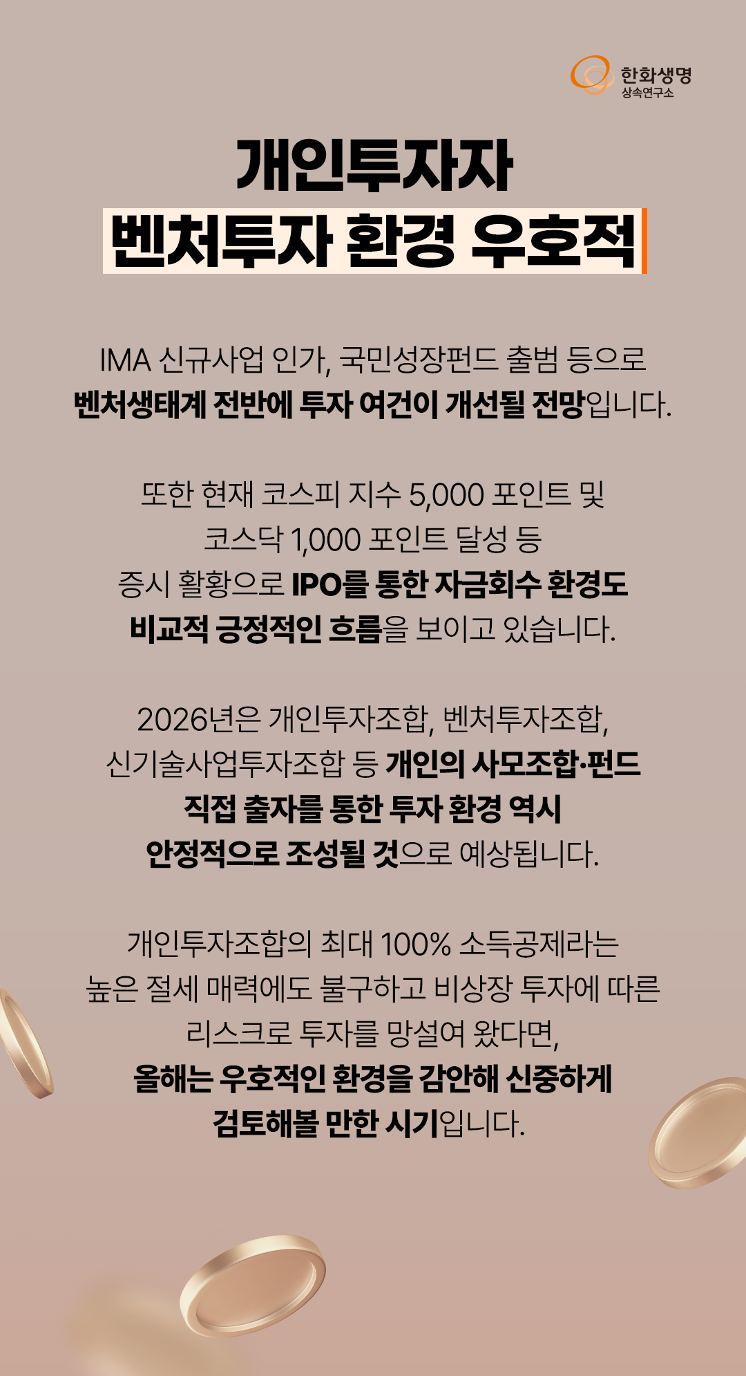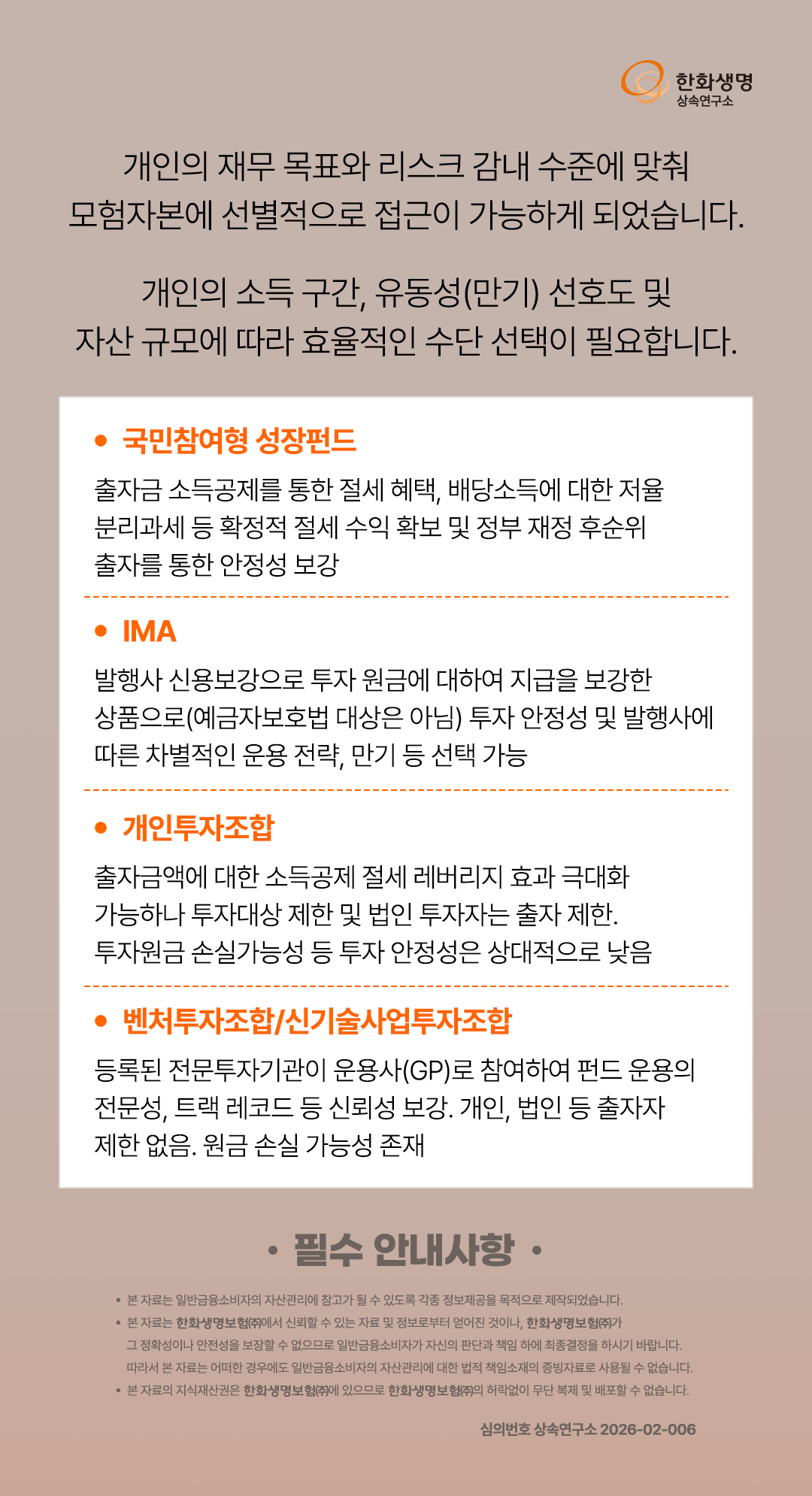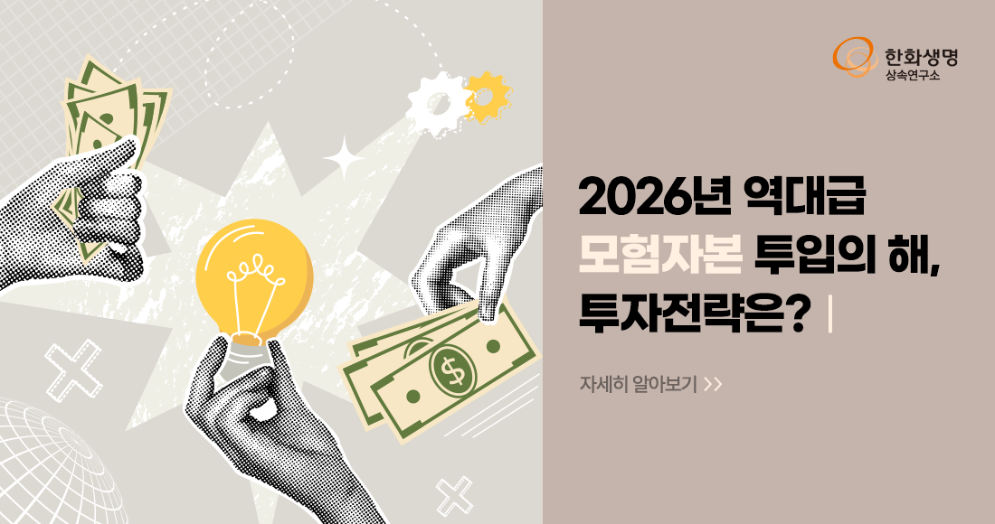 상속연구소 2026년 역대급 모험자본 투입의 해, 투자전략은?(feat. 한화생명 상속연구소) 라이프앤톡 2026. 2. 12. 16:11 더 많은 정보는 한화생명 상속연구소 홈페이지에서! 👇 https://familyoffice.hanwhalife.com/ 공유하기 게시글 관리 한화생명 블로그 Life & Talk 저작자표시 (새창열림) '상속연구소' 다른 글 보러 가기 투자 시대, 퇴직연금도 챙기셨나요(feat. 한화생명 상속연구소) 3040 자산가의 상속·증여 트렌드(feat. 한화생명 상속연구소) 고배당 분리과세, 세금 전략의 새로운 선택(feat. 한화생명 상속연구소) 2026년 주택시장 전망과 투자 접근 포인트(feat. 한화생명 상속연구소)